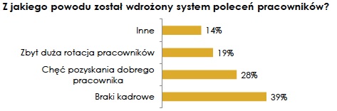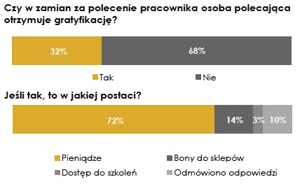 Wyniki badań pokazały, że badane firmy w większości obejmują systemem poleceń zarówno pracowników, jak i kandydatów, nie ograniczają się więc tylko do zasobów wewnętrznych, jakimi są obecni pracownicy. Muszę przyznać, że trochę mnie to zdziwiło, bo wydawało mi się, że tendencja będzie odwrotna i większość badanych pracodawców obejmie systemem poleceń jedynie swoich pracowników. Oczywiście biorąc pod uwagę sytuację na rynku pracy, nie powinniśmy się dziwić, że firmy rozszerzają swoje źródła poszukiwań i szukają każdej sposobności na dotarcie do upragnionych kandydatów.