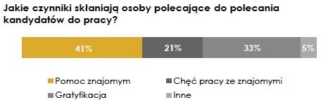 Przyznaję, że bardzo ciekawiło mnie z jakich powodów osoby polecające rekomendują swoich znajomych do pracy. Jak się okazuje, niespełna połowa pracodawców analizuje tego typu czynniki. Dla 41% ankietowanych chęć pomocy znajomym okazała się wystarczającym powodem do polecenia. Gratyfikacja była motywująca dla 1/3 badanych, a dla ponad 20% respondentów istotna była chęć pracy ze znajomymi. Wyniki te warto odnieść do literatury przedmiotu, która zauważa, że czynniki skłaniające osoby do polecania kandydatów możemy podzielić na wewnętrzne, zewnętrzne i społeczne. Co ciekawe, to postawa wobec pracy ma warunkować, które czynniki będą istotne dla poszczególnych osób. Dla przykładu – ci, którzy wykazują pozytywne postawy wobec pracy mają motywację wewnętrzną do polecania, natomiast ci, którzy nie mają pozytywnych postaw też będą polecać kandydatów, jednak w oparciu o zewnętrzne motywatory w postaci nagród oferowanych przez pracowników.